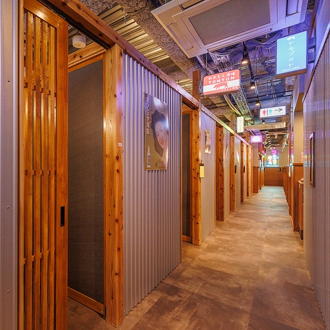 TONTONの通路沿いに並ぶ個室は、外観の無骨さと木の温もりが絶妙に調和した造り。開放感のあるレイアウトながら、個室内はしっかりとプライベートが保たれ、周囲を気にせずゆったりと食事が楽しめます。仲間との語らいや一人飲みにも最適です。