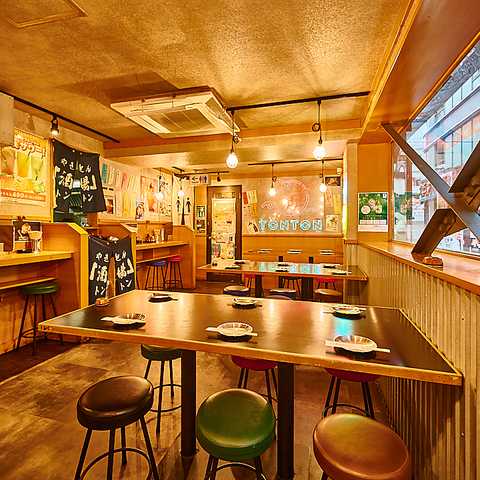 個室だけではなく、1階のお席はオープンスタイルになっています。2~12名様までご利用いただけます。カラフルな可愛い椅子やちょっとした遊び心が溢れる楽しい空間で、お食事をお愉しみいただけます。上野の串焼き豚酒場の雰囲気を存分にお味わい下さいませ。