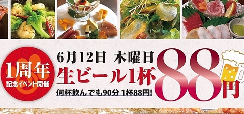 6月12日(木曜日)限定!はちの台所1周年記念につき生ビール1杯88円(税込96円)!90分間何杯でも楽しめます◎