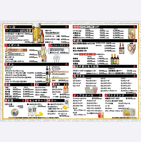 | 料金 | ★飲み放題(90分)2178円(税込) ・追加30分726円(税込) ★ソフトドリンク飲み放題(90分)968円(税込) |