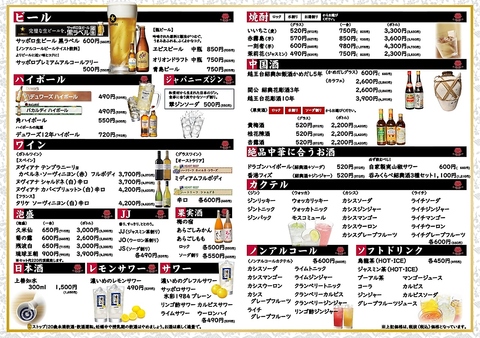 | 料金 | ★飲み放題(90分)2420円(税込) ・追加30分770円(税込) ★ソフトドリンク飲み放題(90分)1078円(税込) ・追加30分363円(税込) |