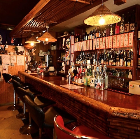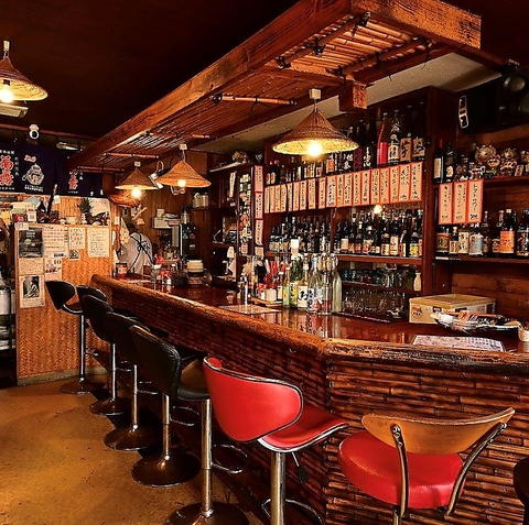【カウンター席:8名】竹を基調とした落ち着いたカウンター席は、お一人様でもしっとりとお酒を楽しめる空間。全8席のゆとりある配置で、仕事帰りのサク飲みや普段のお食事にも最適です。目の前に並ぶ豊富な泡盛を眺めながら、沖縄おでんが染み渡る至福のひと時を。