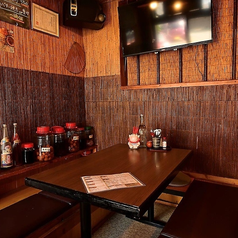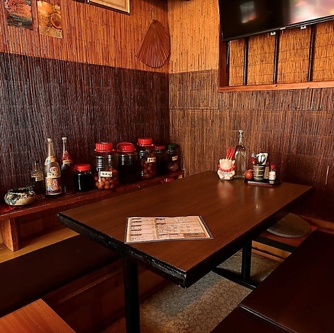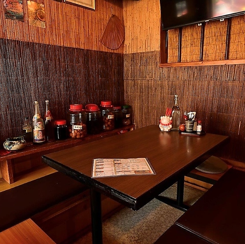 木の温もりを感じる壁に囲まれた、ゆったりと寛げるお座敷席をご用意しております。2名様から6名様用のテーブルが2卓ございますので、落ち着いた空間の中で、周りを気にせず仲間と語り合いたい宴会や模合に大人気のお席ですので、事前のご予約をお願いします。楽しいひとときを、お楽しみください。