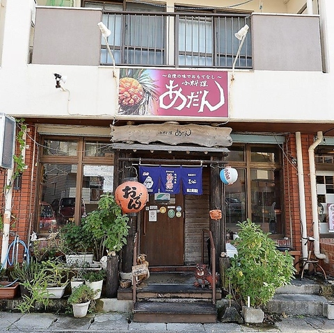 【創業37年・温かな名店】那覇市内から車で20分、屋冨祖通りからも徒歩圏内の好立地。看板メニューの「あだん」のロゴと赤提灯が、隠れ家のような安心感を演出します。一歩入れば、気取らない笑顔で迎えてくれるスタッフと、長年愛されてきた温かな空間が、心と体を解きほぐします。