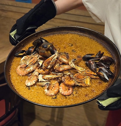 団体様用には本場と同じく巨大なパエリアパンで焼き上げます。