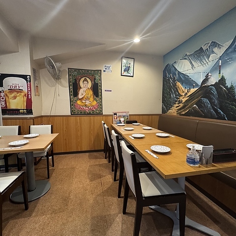 大きなネパールの山々を描いた絵が印象的な店内は広々としてモダンな雰囲気でゆっくりとお過ごしいただけます。アジアンなインテリアがお客様をお迎えいたします。