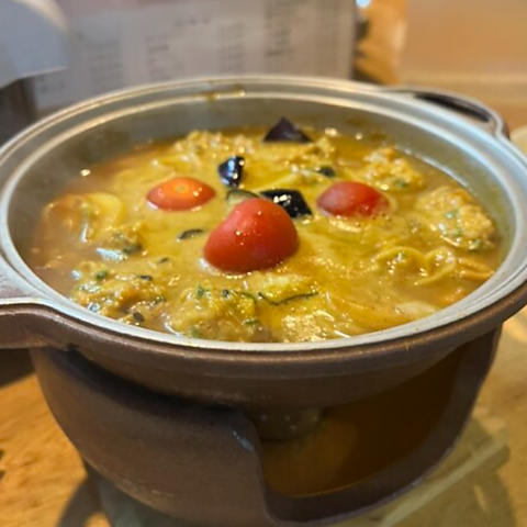 名古屋コーチンの出汁をたっぷり使った特製カレースープが、鶏肉や野菜にじんわり染み渡る至福の一鍋。なす、ブロッコリー、プチトマトなどの夏野菜と、まろやかでコク深いスープが絶妙に絡み合い、夏にぴったりの一品です。