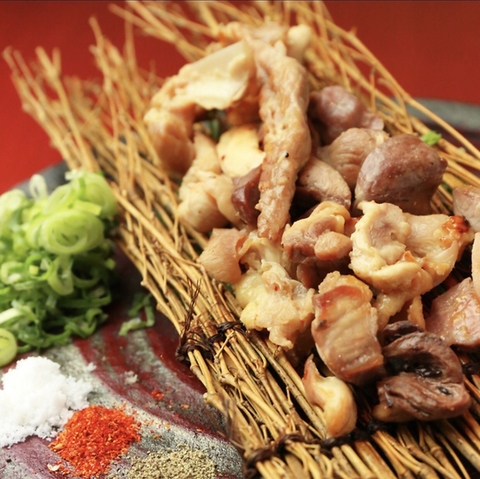 ズリ・せせり・ハラミ・もものたくさんの部位を一度に味わえる鶏のバラ焼き。部位ごとに違ったコリコリ・プリプリとした食感やジューシー・さっぱりなどのそれぞれの味わいを一度に楽しめます。また自分好みの味を見つけてほしいとのオーナーからの希望で、山椒・七味・ブラックペッパー・岩塩・柚子胡椒を付けています。※写真は一例です