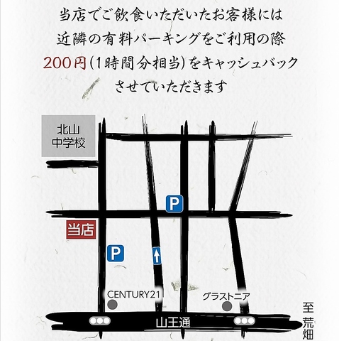 当店でご飲食いただいたお客様には近隣の有料パーキングをご利用の際200円(1時間分相当)をキャッシュバックさせていただきます。