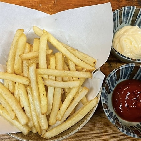 ポテトフライは、外はカリッと、中はホクホクとした食感が楽しめる人気のスナックです。ポテトフライには、ケチャップとマヨネーズの2種類のディップが添えられています。ケチャップの甘酸っぱさがポテトの塩味と絶妙にマッチし、マヨネーズのクリーミーさがさらにコクを加えます。おつまみとしても、軽食としても大変人気があり、家族や友人との集まりにもぴったりな一品となっております。