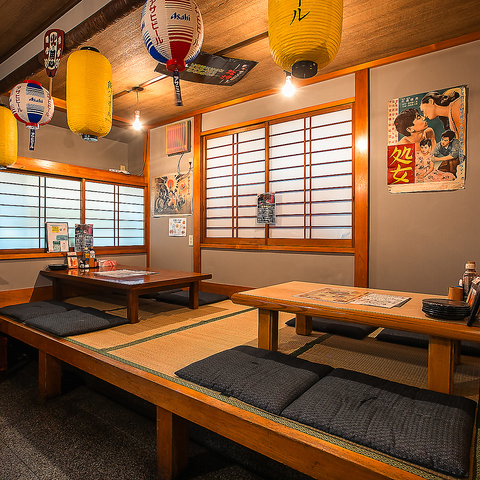 懐かしさ感じる居心地の良い空間。お気軽にお立ち寄りください!外観の提灯や木を基調としたあたたかみのある店内が、どこか懐かしい昭和レトロな雰囲気を感じさせます。足を伸ばしてゆったりとお寛ぎいただける、広々とした小上がりの座敷もご用意。ご家族や友人とのお食事、会社のご宴会など幅広いシーンに対応可能です♪