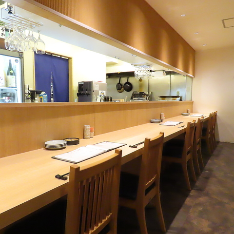 目の前で職人の手仕事が楽しめるカウンター席は、料理が生まれる臨場感を味わえる特等席。香りや音、仕上げの瞬間まで五感で楽しめる贅沢な空間です。デートやおひとり様のご利用にもおすすめの、静かで心地よいひとときを。