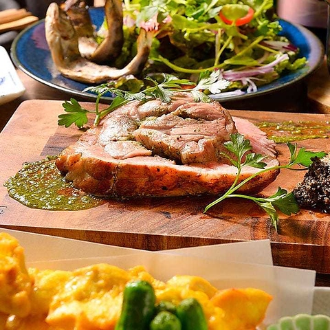 香辛料やハーブを詰めた豚の塊肉を、囲炉裏でじっくりと焼き上げます。お肉の旨味と柔らかさはまさに天下一品。売り切れにもなってしまうほど人気なメニューです。定番の【たきび炉端コース】と【みみずく とっておきコース】でお楽しみいただけます。