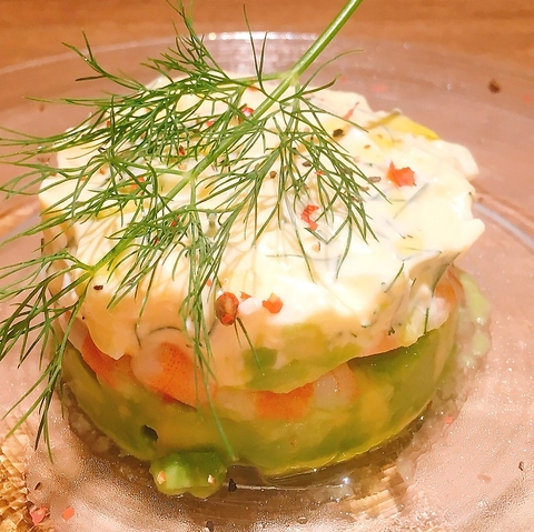 お料理の見た目にもこだわり。写真の「森薫るスモークカルパッチョ」は、ムビジェ必須!瞬間燻製でいただく新しいタイプのお刺身です。口に入れた瞬間に燻の香りに包まれ、コーティングされているかのような舌触りが特徴。醤油とマスタードの2種類で楽しめます。サーモンとホタテはマスタードでいただくのがオススメ◎