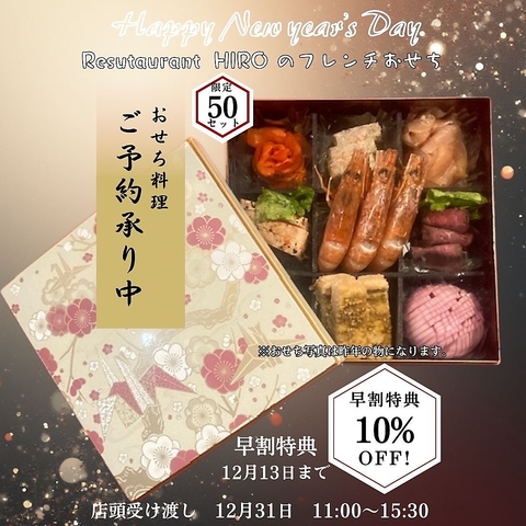お品書き(全20品)・鮑のしっとり煮 ・ホタテ燻製バター ・魚貝テリーヌ ・特選ローストビーフ・当店名物牛頬肉のシチューなど。・ 早割 上記の価格より10%OFF 12月13日まで・お渡し:12月31日(11:00-15:30)・ご予約はお電話にて※掲載写真は昨年のものです。今年はさらに磨きをかけてお届けします。