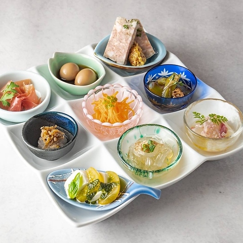 おちょこ (小鉢)に和食、洋食の前菜を9種盛り合わせています。 ※事前予約のみ 暇だったらつくります...