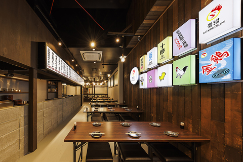 提灯が灯り、長机で肩を並べて楽しいひとときを過ごす、懐かしさとくつろぎが漂う雰囲気です。店内は天井が高く開放的であり、テーブル同士の間隔も広く設定されており、他のお客様を気にせずにくつろげる空間となっています。