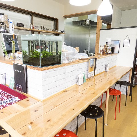 お一人様でも気軽に利用できる落ち着いた空間です。木の温もりが感じられる広々としたテーブルが特徴で、目の前にはアクアリウムが設置されており、癒やしのひとときを演出します。ランチやコーヒータイムに、ゆったりと過ごすのに最適な特等席です。