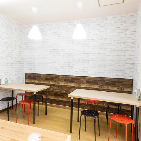 4名様用テーブル席は、白レンガ調の壁紙が明るい印象を与える、清潔感あふれるスペースです。赤と黒のモダンなスツールがアクセントとなり、友人とのランチや女子会、ご家族でのティータイムなど、様々なシーンでカジュアルに心地よく過ごせる空間となっています。