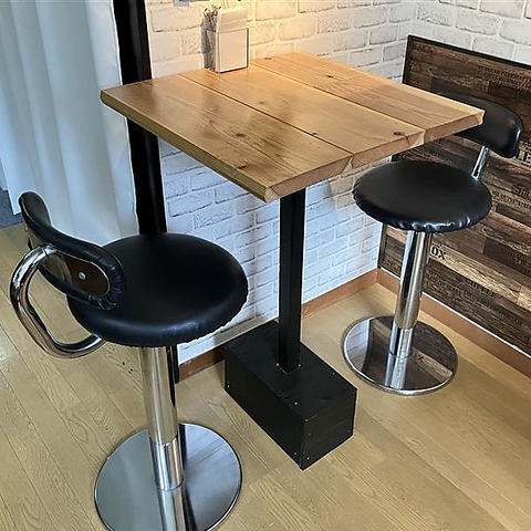 2名様用テーブル席は、デートや親しい友人との語らいにぴったりな、隠れ家のようなコンパクトな空間です。温かみのある木製天板のテーブルに、背もたれ付きのスタイリッシュな黒のハイチェアを設置。白レンガ調の壁が柔らかな雰囲気を醸し出し、二人だけの特別な時間を演出します。