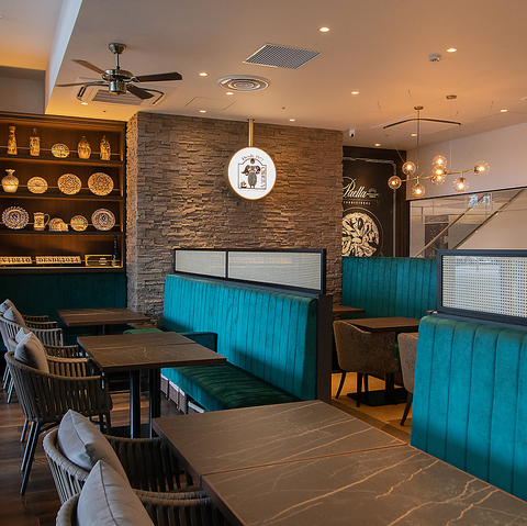 地中海をイメージしたターコイズブルーのソファーが色鮮やか。地中海をイメージした店内でゆっくりとお食事いかがでしょうか♪