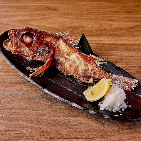 高級魚の代名詞・キンキを、豪快な炉端焼きで。炭火の強火力で一気に焼き上げることで、真っ赤な皮目はパリッと香ばしく、中の白身は驚くほどふっくらジューシーに仕上がります。最大の魅力は、熱で溶け出した「脂の甘み」。滴る脂が炭に落ち、燻された香りがさらに食欲をそそります。凝縮された旨味と、口の中でとろける贅沢な質感。まさに炭火の魔法が宿る、至高の一皿をぜひご堪能ください。