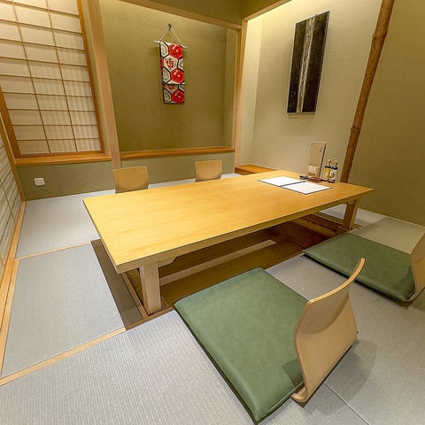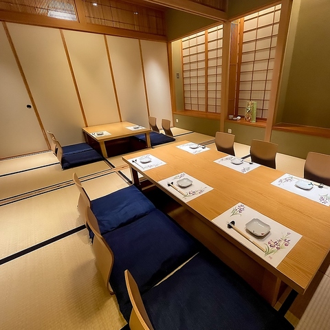広々とした個室のお席ではお履物を脱いで上がる小上がりのお席です。完全個室のお席もございますのでご接待や会合などビジネスシーンをはじめ、顔合わせや慶事などお祝い事にも最適なお部屋です。下見やご相談も大歓迎ですので是非、お気軽にお問い合わせください。