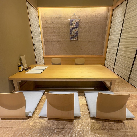 当店では様々な利用シーンに最適なお席を多数ご用意しておりります。開放感のあるテーブル席や職人の技が目の前で味わえるライブ感あふれるカウンター席、そして掘り炬燵の完全個室を完備。和室の広々とした空間で優雅なお食事をご堪能ください。