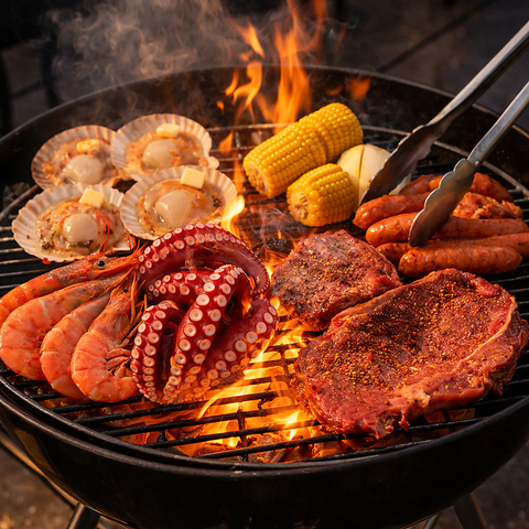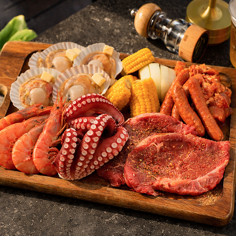 飲み放題付!赤海老・ホタテ・タコ海鮮3種×極厚牛肩ロースWメインBBQコース 6000円