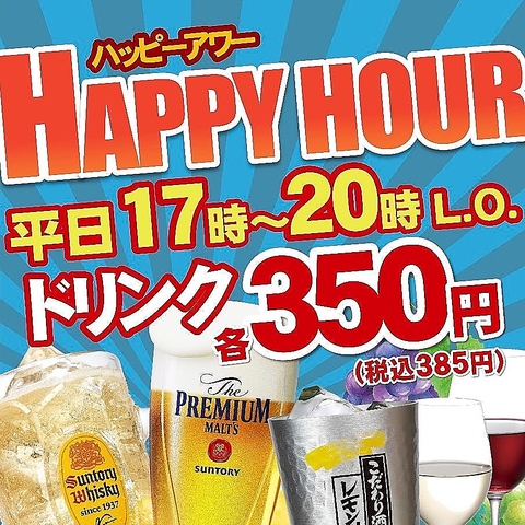各飲み放題のプランは、+500円でプレモル付きにランクアップ可能♪また、平日17時~19時の「ハッピーアワー」では、プレモル、角ハイ、グラスワイン、こだわり酒場のレモンサワーが、385円で楽しめます◎