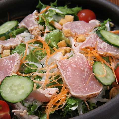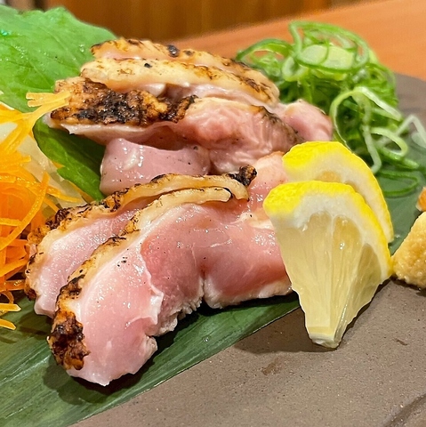 炙った朝引き鶏のタタキ。歓送迎会の夜ご飯にぴったりのメニューです。