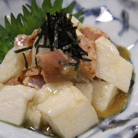 長芋と朝引き鶏をわさびで和えたさっぱりとした一品。歓送迎会や居酒屋での夜ご飯に。