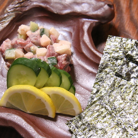 炙った鶏肉を使ったユッケ。居酒屋での夜ご飯にぴったりのメニュー。