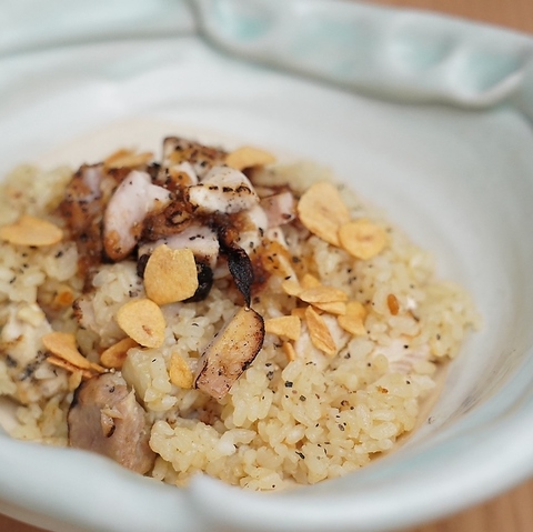 チキンブイヨンで炊き込み、仕上げにニンニクとオイルで軽く煽り提供しております。