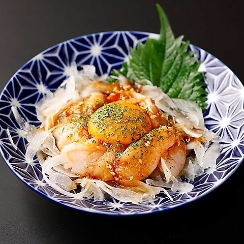 低温調理でしっとり仕上げたささみに、特製の甘辛ユッケダレを絡めました。卵黄をとろりと絡めれば、至福のコクと旨味が口いっぱいに。