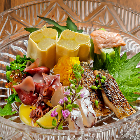ホタルイカと九条ネギ酢味噌ふきの湯葉巻き ちりめん山椒真鯛の酒粕塩締め桜湯葉と若竹しんじょう酒粕へしこトロニシン※季節や時期により内容を変更しております。 税込 1639円(税込)