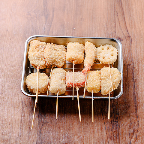 串揚げができるまでの工程、すべてにこだわり有り!豚カツ、牛カツの定番はもちろん、れんこん、玉ねぎ、長芋などヘルシーなメニューもご用意!季節に合わせたオススメ串もご用意!