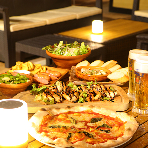 「枝豆ペペロンチーノ」や「鉄板ソーセージ」をはじめボリューム抜群の「グリルチキン」もお楽しみいただけるAコースなど3種類ご用意!開放感溢れるテラス席で思う存分ご堪能ください。