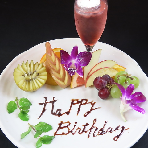 年の一度のバースデーを御祝いする大切なディナー。思い出に残したい記念日には主役をもてなすおしゃれなサプライズをいかがでしょうか?色とりどりのフルーツやドリンクを盛り付けたプレートで場が一段と盛り上がり、笑顔が広がる素敵なひとときをお過ごしいただけます♪大切な人への想いを形にする、心のこもったサービスをぜひご利用ください