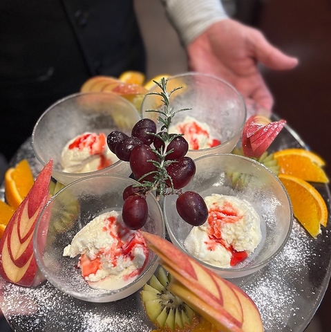 コースをご予約の方はお食事の最後を締めくくるデザートをゴージャスなフルーツ盛り合わせに変更することもできます♪旬の果物をふんだんに使い、彩り豊かなフルーツの盛り合わせ。みずみずしい甘さと香りが口いっぱいに広がり、至福のひとときを演出してくれます◎季節の恵みを存分に味わえるひと皿は、特別な記念日の素敵な思い出になります♪