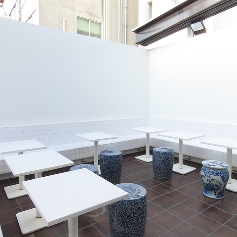 白い壁とテーブルが並ぶテラス席は、外の風を感じながらお食事を楽しめます◎開放的な空間で、心地よいひとときをお過ごしいただけます♪昼は自然光の陽射しで明るく、夜はライトで照らされたムードある空間と異なる雰囲気を楽しめるのもテラス席の魅力。ぜひご利用のシーンに合わせてご活用ください!