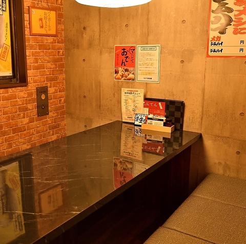 店内は温かみのある照明に照らされたモダンでお洒落な空間です♪ブラウンや黒を基調としたインテリアが、落ち着いた雰囲気を演出しております☆ゆったりと落ち着ける個室空間で、当店自慢の串天や逸品料理、美味しいお酒やドリンクを心ゆくまでお楽しみください◎仲間と美味しい料理とお酒を囲めば楽しい時間がもっと楽しくなること間違いなし★