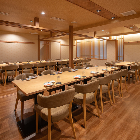 落ち着いた和の空間で大人数でのご宴会を。部署全体の飲み会、同窓会、結婚式の二次会など、多様なシーンにご利用いただける広々としたお部屋です。温かみのある照明と木のぬくもりが心地よい空間で、ゆったりとお過ごしください。お料理は旬の食材を活かしたコースをご用意し、当店で素敵な時間をお過ごしいただけます。