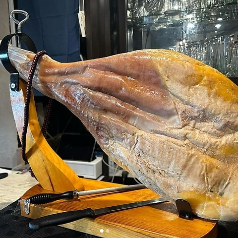 当店自慢の「生ハム切り落とし」は、スペイン産ハモンセラーノの原木を、オーダーが入ってから切り落としております。単品でも美味しく、さらにこの生ハムを使った「生ハムマルゲリータピザ」「生ハムユッケ」「アヒージョ」も絶品です!贅沢な味わいが特徴のハモンセラーノ、是非お好みのワインやお飲み物と共にお楽しみください♪