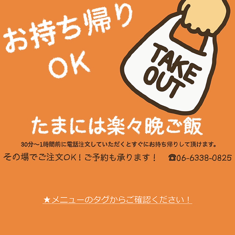 当店自慢の料理がテイクアウトでも味わえます♪事前にお電話にてご連絡をいただき、お店にご来店ください!