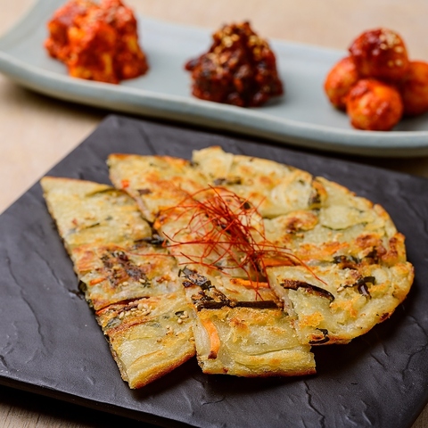 外はカリッ、中はもっちり食感が、一口食べたら止まらないチヂミ。フライパンでごま油の香りをまとわせながら、こんがりと焼き上げます。