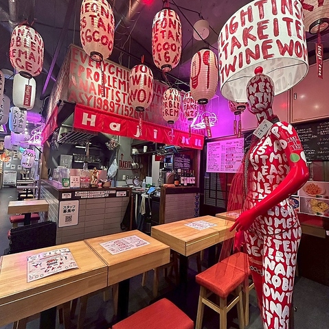 三宮駅すぐの横丁内にある、ネオンと提灯が目を引くイタリアンバル《Hajiバル》。フォトジェニックな空間で、気軽に本格イタリアンとワインが楽しめるお店です。看板娘マネキンニキータがお出迎えする印象的な店内は、まるでアートギャラリーのような非日常空間。