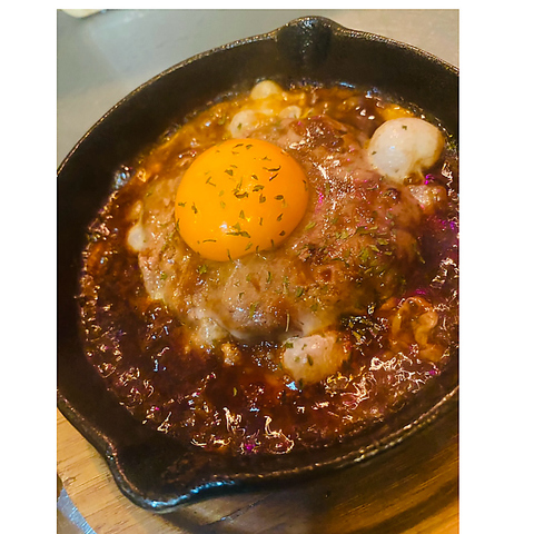 一つ一つ手作りで作っています。鉄板での提供で隠し味にレーズンが入っていて臭みがなく、ほのかな甘みがクセになる特製のデミグラスソースと一緒にお召し上がりください!