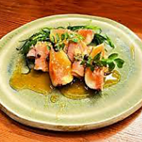 時間をかけて、お箸でほろっと崩れるくらい、とろっとろっにした豚肉を新じゃがのマッシュと甘っからい餡と一緒にお召し上がりください。アクセントの木の芽が最後は香り、絶妙な一品です。化学調味料や色粉など不使用で、無添加にこだわったsuirenの料理。お酒を飲みながら美味しくいただけるメニューが揃っています。