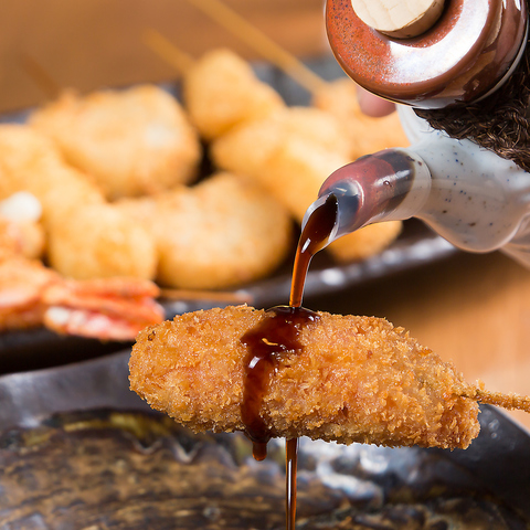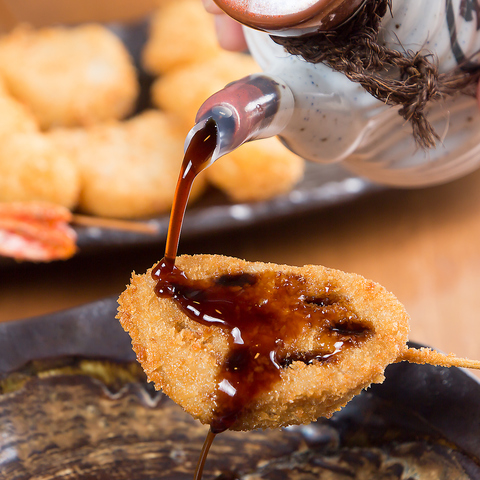 サクサクの食感の串揚げに自家製ブレンドのソースをかけてお楽しみください♪お酒との相性も抜群です!!